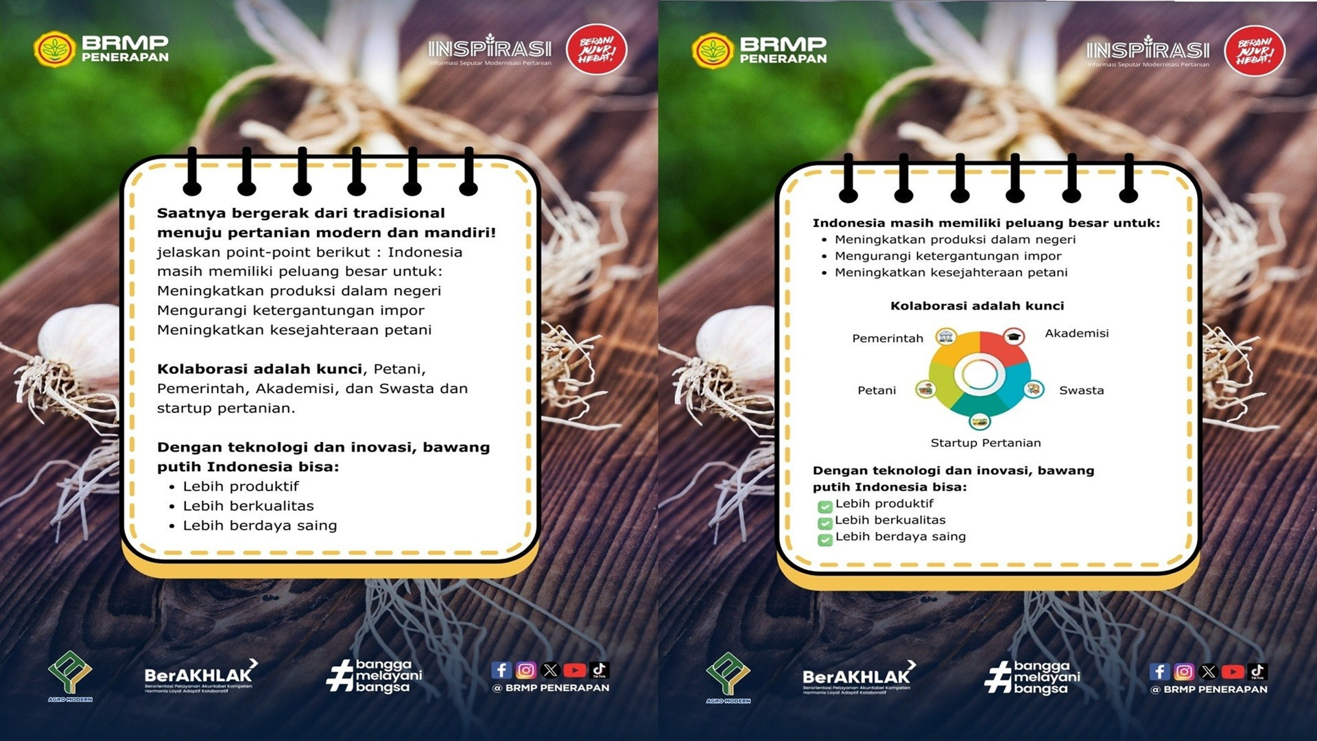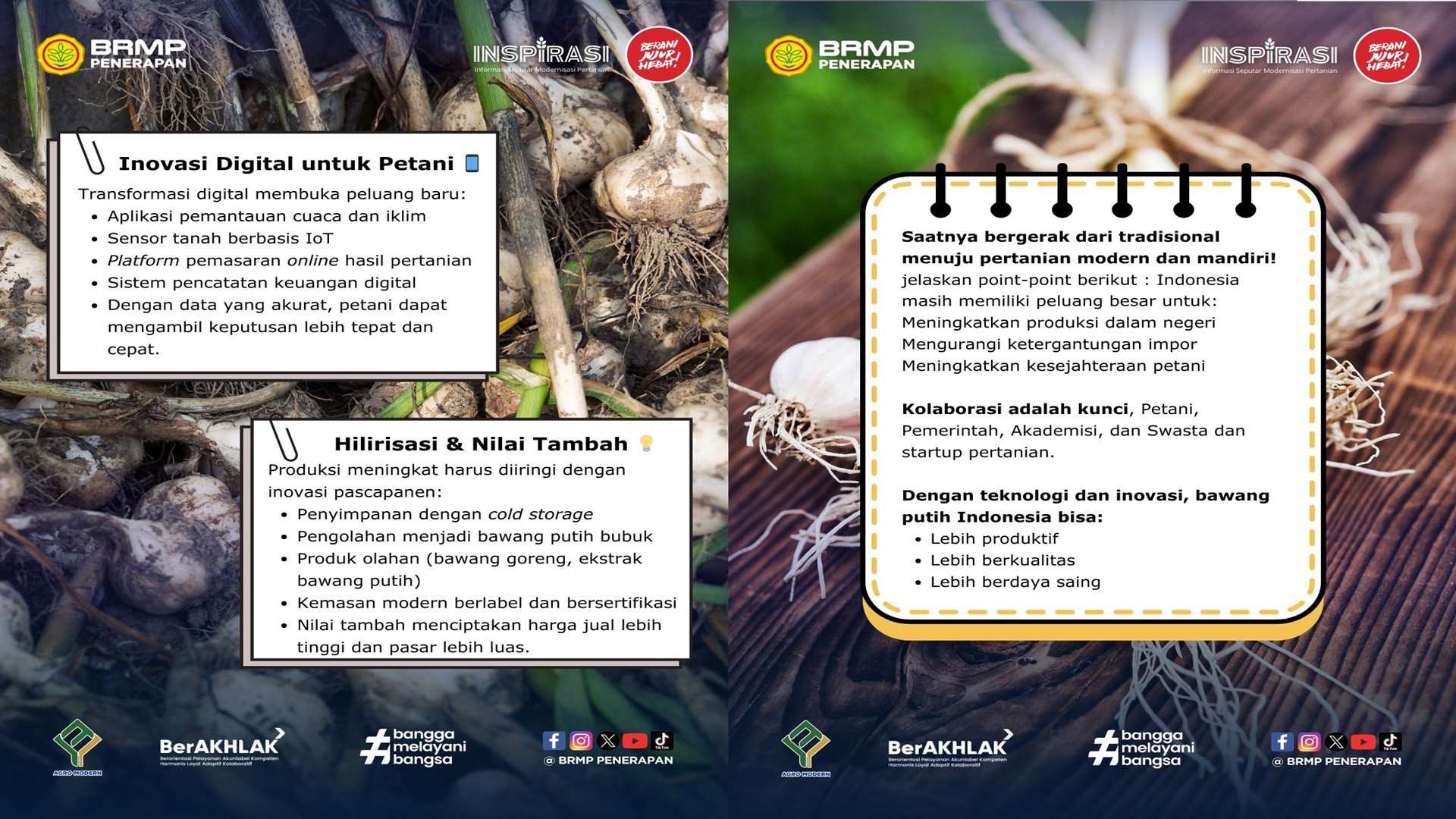 Badan Perakitan dan Modernisasi Pertanian (BRMP) mengusung modernisasi pertanian berkelanjutan dengan inovasi teknologi yang meningkatkan produktivitas, efisiensi, dan daya saing sekaligus menjaga kelestarian lingkungan. Melalui penelitian, perakitan teknologi, mekanisasi, dan digitalisasi, BRMP membangun sistem pertanian yang cerdas, ramah lingkungan, dan tangguh menghadapi tantangan masa depan.